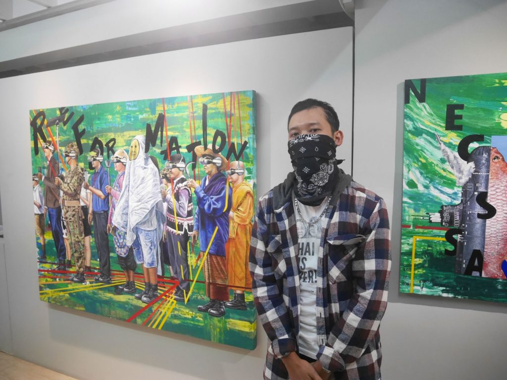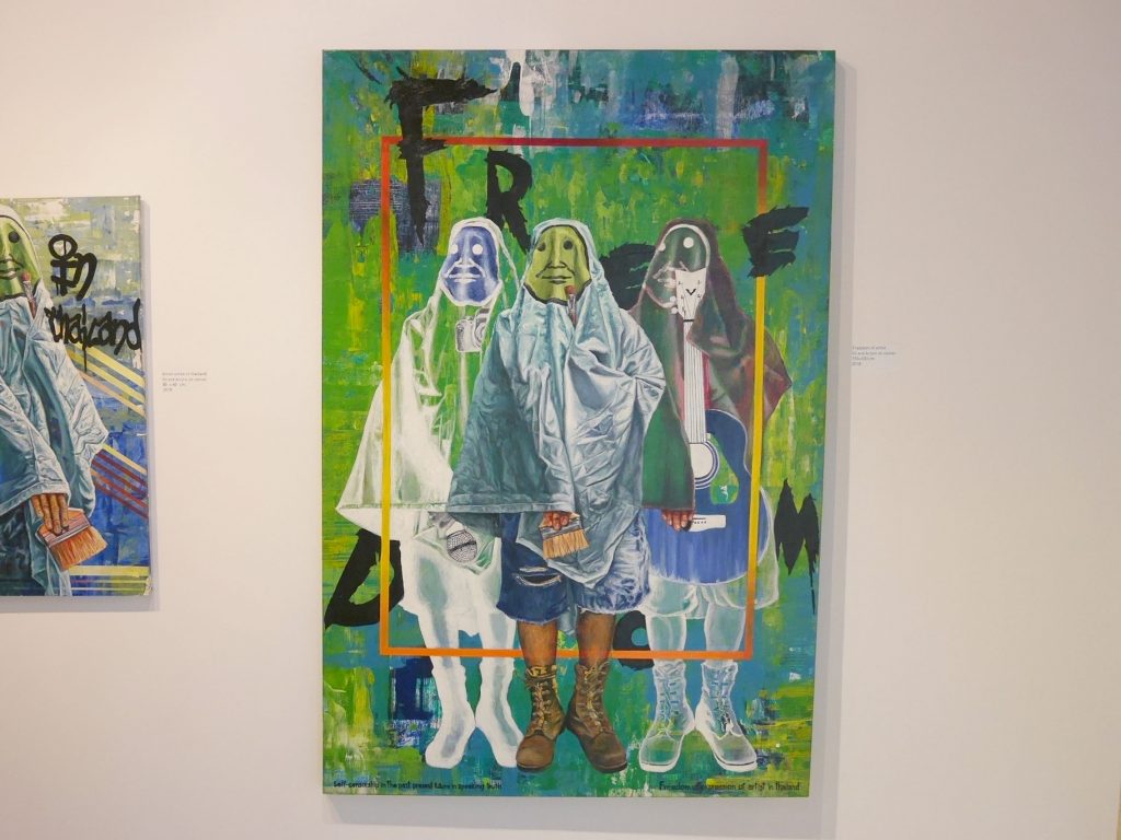 食品、農業、バイオテクノロジー、健康、医療、電子制御システム、デジタルネットワーク、人工知能、クリエイティブ産業などの分野が協力することで達成される新しくより良い未来を提唱した政策 “Thailand 4.0” がモチーフとなっているようで、人物たちはそれぞれの手にその職業を思わせるアイテムを持っており、頭に装着したヘッドマウントディスプレイで理想の未来をバーチャルで見せられながら、さまようように同じ方向へと歩く姿が皮肉を込めて描かれています。この中で唯一ヘッドマウントディスプレイを装着していないのは、中央に描かれた画家だけです。これは作家自身を表しているようです。