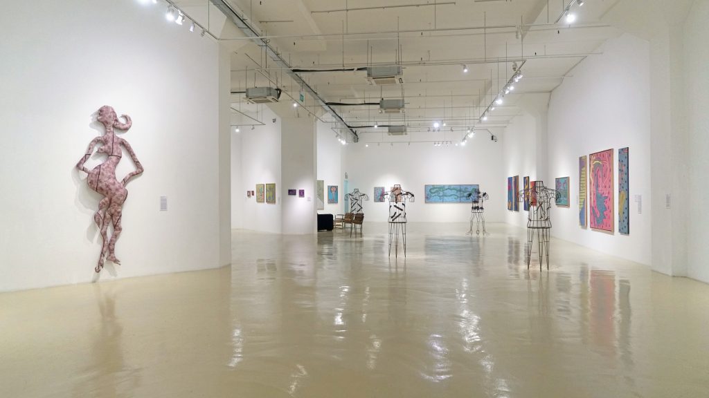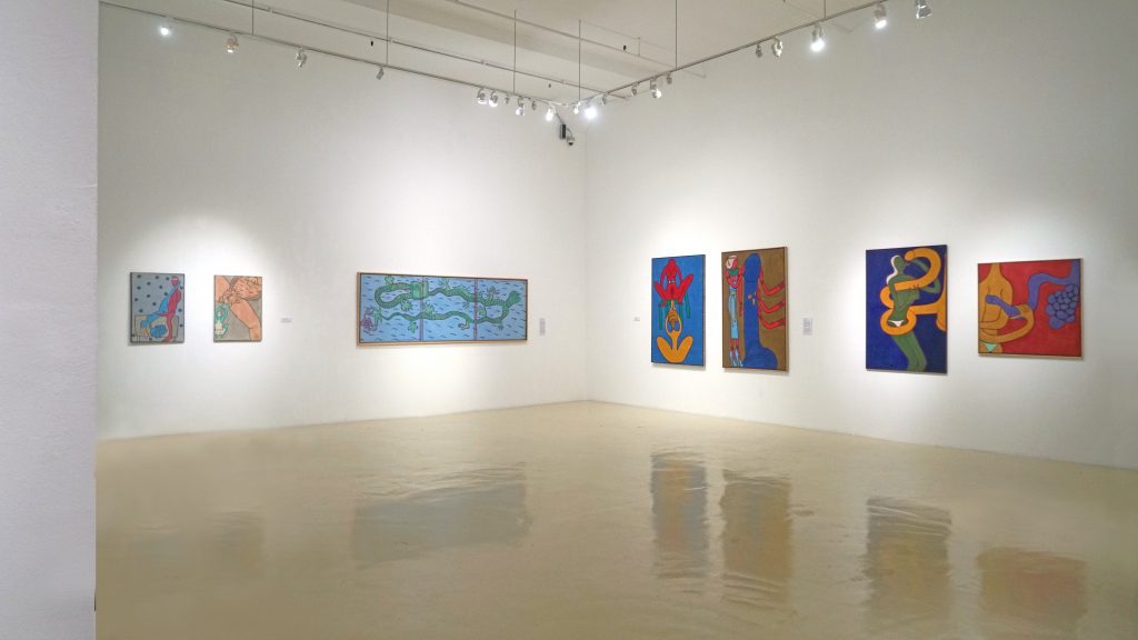 The exhibition presents the evolution of her works throughout the course of her active years as an artist—from her early pastel-coloured works that reveal traces of the Pengosekan style in which she was trained, toher bolder, brighter and more grotesque paintings in which she later became known. The show further presents the breadth and range of her themes: from her frank depictions of sex and power; surreal objects,creatures and characters; wild, vivid dreams and desires to ever-evolving reclamations of the body.