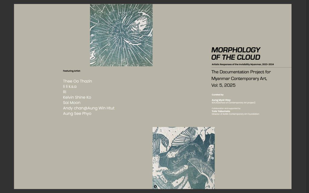 Morphology of the Cloud: Artistic Responses of the Invisibility Myanmar, 2023-2024, The Documentation Project for Myanmar Contemporary Art 2025, Vol. 5, a collaborative production of Aura Contemporary Art Foundation and the School of Contemporary Art (SoCA), is now available. Six contemporary artists from Myanmar have been selected for this project, and we are pleased to present the video interviews and catalogue accompanying this project.